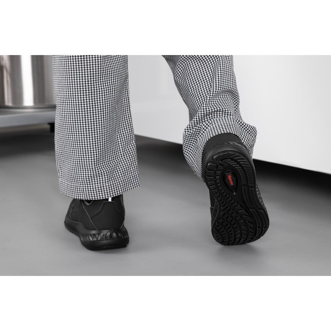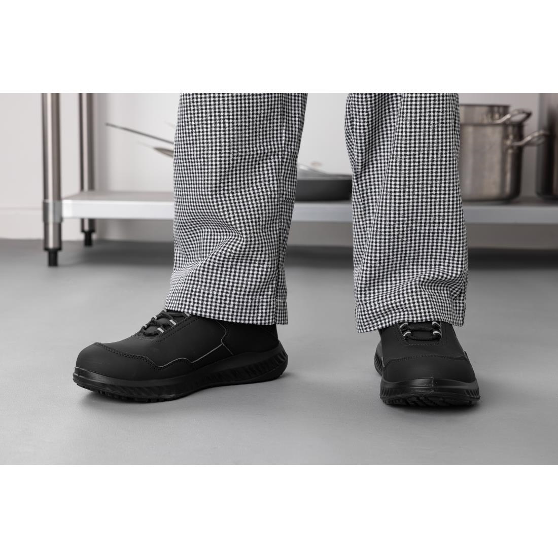 Black microfibre uppers are robust and easy to clean, retaining a smart appearance while coping with the daily wear and tear of hospitality use. Cushioned insoles are perforated to increase airflow, supported by a breathable Airmesh lining that lets heat, sweat and moisture escape quickly – Slipbuster Hawren work trainers keep feet feeling fresh, cool and dry in hot kitchens.