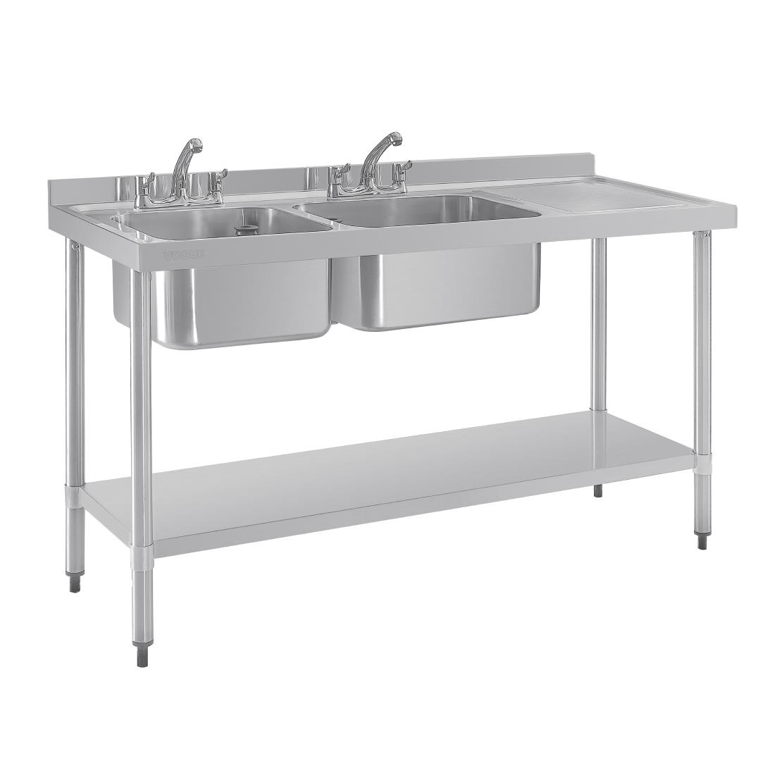 Functional and versatile, the double bowl sink with right hand drainer from Vogue is ideal for the busy professional kitchen, allowing you to soak or rinse dishes in one sink whilst cleaning in the other.